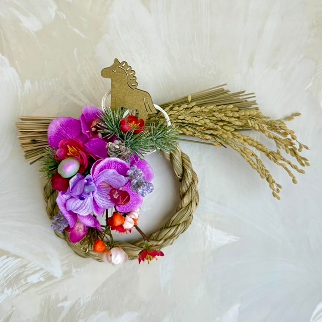 Size 直径25cm (花器は非売品です) 〜Mie de La Fraiseのしめ縄飾りの特徴〜 毎年イヤーズプレートを集めるように、その歳その歳のあなた様の心にぴたりと来るお花をお選び下さいませ。 そしていくつか集まった時、それらを一つの器や花器に合わてみてください。 そこにはあなた様だけの《特別に素晴らしい世界観を持った作品が誕生》することでしょう。 是非ともお試しください! 尚、お花はしめ縄から簡単に取り外せる仕様になっております。しめ縄飾りとして飾られた後は、長く『リビングアクセサリー』としてお楽しみ下さいませ。 どうぞ良いお年をお迎え下さい。 ◉ご購入の際の注意点 ・ひとつひとつ丁寧に制作しておりますが、 ハンドメイド作品でありますことをご理解の上 ご購入いただけますと幸いです。 ・アーティフィシャルフラワーは 生花をリアルに美しく再現して作られた、 繊細で上質な造花です。 ・直射日光に長時間当たりますと 変色する場合がございます。 また、風雨にさらされる場所での ご使用はお控えください。 ・お花の色や質感など、写真と実物が多少違って 見える場合がございます。 ・梱包には十分気を付けておりますが、配送中に 花材が取れてしまうことがございます。 その際は恐れ入りますが、お客様お手持ちの 接着剤(ボンドやグルーガン等)で 止めていただけますと幸いです。 ・他店でも販売しておりますので、 売り切れの際はご容赦くださいませ。 ◉キャンセル・返品について ・ご注文後のキャンセルやイメージの違いなど、 お客様のご都合による返品や返金、 交換などの対応はお断りしております。