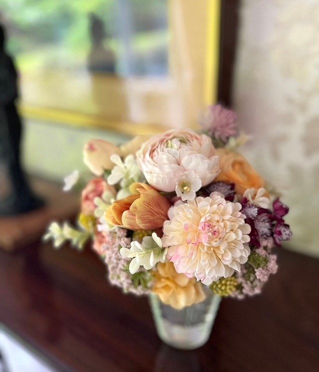 Size w25×h20cm (花器は非売品です) 花材 薔薇 紫陽花 ダリア ラナンキュラス チューリップ レースフラワー アンジェリカ アザミ等 ◉ご購入の際の注意点 ・ひとつひとつ丁寧に制作しておりますが、 ハンドメイド作品でありますことをご理解の上 ご購入いただけますと幸いです。 ・アーティフィシャルフラワーは 生花をリアルに美しく再現して作られた、 繊細で上質な造花です。 ・直射日光に長時間当たりますと 変色する場合がございます。 また、風雨にさらされる場所での ご使用はお控えください。 ・お花の色や質感など、写真と実物が多少違って 見える場合がございます。 ・梱包には十分気を付けておりますが、配送中に 花材が取れてしまうことがございます。 その際は恐れ入りますが、お客様お手持ちの 接着剤(ボンドやグルーガン等)で 止めていただけますと幸いです。 ・他店でも販売しておりますので、 売り切れの際はご容赦くださいませ。 ◉キャンセル・返品について ・ご注文後のキャンセルやイメージの違いなど、 お客様のご都合による返品や返金、 交換などの対応はお断りしております。
