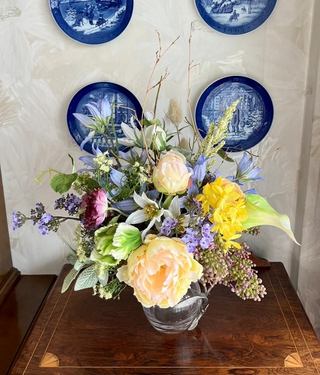 Size w35×h18cm (花器は非売品です) 花材 チューリップ バラ ユーカリ 紫陽花 クリスマスローズ スカビオーサ ポップ 等 ◉ご購入の際の注意点 ・ひとつひとつ丁寧に制作しておりますが、 ハンドメイド作品でありますことをご理解の上 ご購入いただけますと幸いです。 ・アーティフィシャルフラワーは 生花をリアルに美しく再現して作られた、 繊細で上質な造花です。 ・直射日光に長時間当たりますと 変色する場合がございます。 また、風雨にさらされる場所での ご使用はお控えください。 ・お花の色や質感など、写真と実物が多少違って 見える場合がございます。 ・梱包には十分気を付けておりますが、配送中に 花材が取れてしまうことがございます。 その際は恐れ入りますが、お客様お手持ちの 接着剤(ボンドやグルーガン等)で 止めていただけますと幸いです。 ・他店でも販売しておりますので、 売り切れの際はご容赦くださいませ。 ◉キャンセル・返品について ・ご注文後のキャンセルやイメージの違いなど、 お客様のご都合による返品や返金、 交換などの対応はお断りしております。