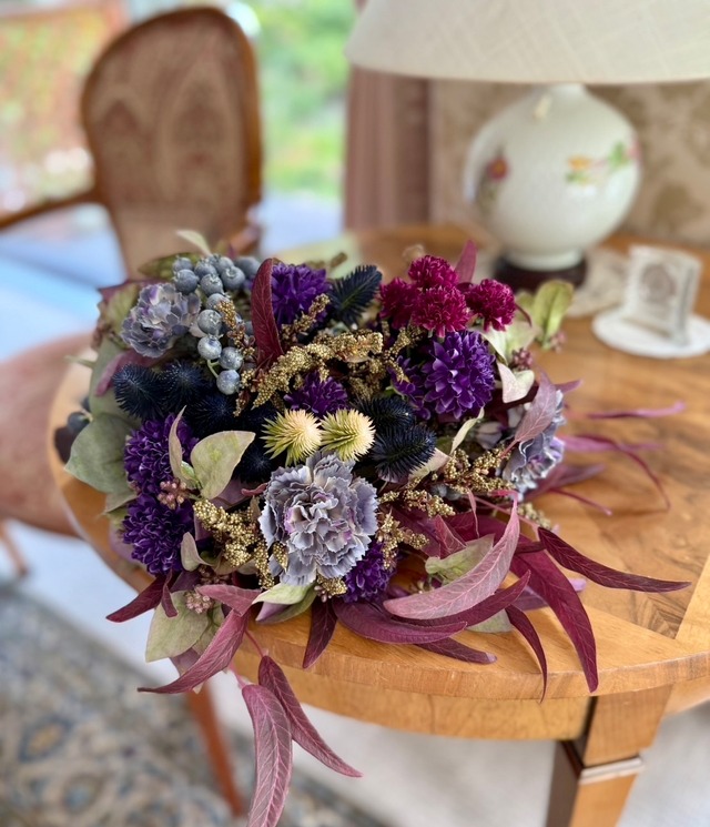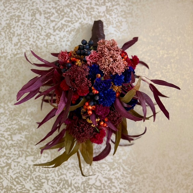 Size w30×h35cm (花器は非売品です) 花材 ボルドーユーカリ ボルドーツイッグリーフ レーヴカーネーション ブルーミーマム ミニョンスプレーマム ニュアンスエリンジウム カラードベリー等 ◉ご購入の際の注意点 ・ひとつひとつ丁寧に制作しておりますが、 ハンドメイド作品でありますことをご理解の上 ご購入いただけますと幸いです。 ・アーティフィシャルフラワーは 生花をリアルに美しく再現して作られた、 繊細で上質な造花です。 ・直射日光に長時間当たりますと 変色する場合がございます。 また、風雨にさらされる場所での ご使用はお控えください。 ・お花の色や質感など、写真と実物が多少違って 見える場合がございます。 ・梱包には十分気を付けておりますが、配送中に 花材が取れてしまうことがございます。 その際は恐れ入りますが、お客様お手持ちの 接着剤(ボンドやグルーガン等)で 止めていただけますと幸いです。 ・他店でも販売しておりますので、 売り切れの際はご容赦くださいませ。 ◉キャンセル・返品について ・ご注文後のキャンセルやイメージの違いなど、 お客様のご都合による返品や返金、 交換などの対応はお断りしております。