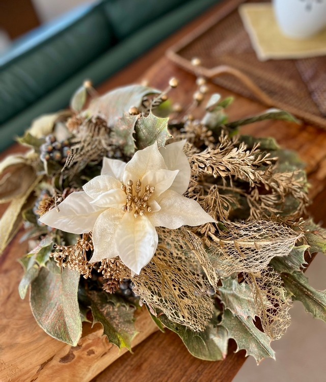 Size w33×h45cm (花器は非売品です) 花材 ゴールドリーフ ゴールドミスルトゥ クラシックホリー ブラッシュベリー 松ぼっくり シナモン マットタイニーベリー 等 ◉ご購入の際の注意点 ・ひとつひとつ丁寧に制作しておりますが、 ハンドメイド作品でありますことをご理解の上 ご購入いただけますと幸いです。 ・アーティフィシャルフラワーは 生花をリアルに美しく再現して作られた、 繊細で上質な造花です。 ・直射日光に長時間当たりますと 変色する場合がございます。 また、風雨にさらされる場所での ご使用はお控えください。 ・お花の色や質感など、写真と実物が多少違って 見える場合がございます。 ・梱包には十分気を付けておりますが、配送中に 花材が取れてしまうことがございます。 その際は恐れ入りますが、お客様お手持ちの 接着剤(ボンドやグルーガン等)で 止めていただけますと幸いです。 ・他店でも販売しておりますので、 売り切れの際はご容赦くださいませ。 ◉キャンセル・返品について ・ご注文後のキャンセルやイメージの違いなど、 お客様のご都合による返品や返金、 交換などの対応はお断りしております。