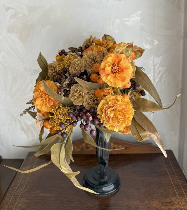 Size w30×h45cm (花器は非売品です) 花材 グラミネグラススプレー レーヴカーネーション ロージーマリーゴールド ブルーミーマム ミニョンスプレーマム ボルドーツイッグリーフ フォール細葉ユーカリ等 ◉ご購入の際の注意点 ・ひとつひとつ丁寧に制作しておりますが、 ハンドメイド作品でありますことをご理解の上 ご購入いただけますと幸いです。 ・アーティフィシャルフラワーは 生花をリアルに美しく再現して作られた、 繊細で上質な造花です。 ・直射日光に長時間当たりますと 変色する場合がございます。 また、風雨にさらされる場所での ご使用はお控えください。 ・お花の色や質感など、写真と実物が多少違って 見える場合がございます。 ・梱包には十分気を付けておりますが、配送中に 花材が取れてしまうことがございます。 その際は恐れ入りますが、お客様お手持ちの 接着剤(ボンドやグルーガン等)で 止めていただけますと幸いです。 ・他店でも販売しておりますので、 売り切れの際はご容赦くださいませ。 ◉キャンセル・返品について ・ご注文後のキャンセルやイメージの違いなど、 お客様のご都合による返品や返金、 交換などの対応はお断りしております。