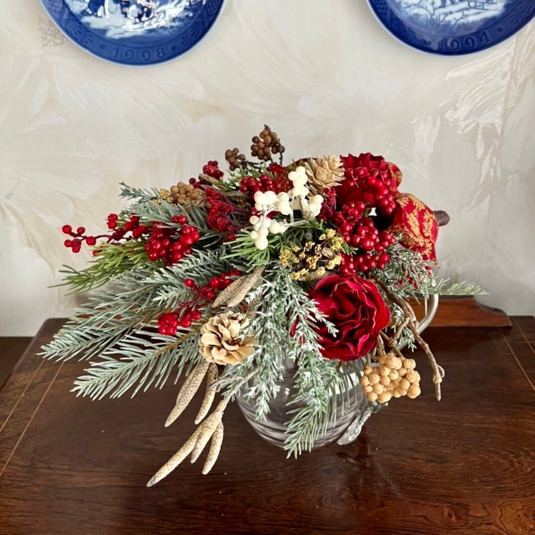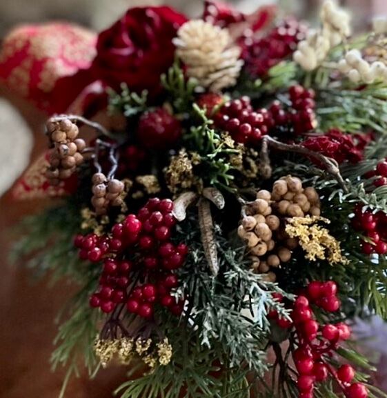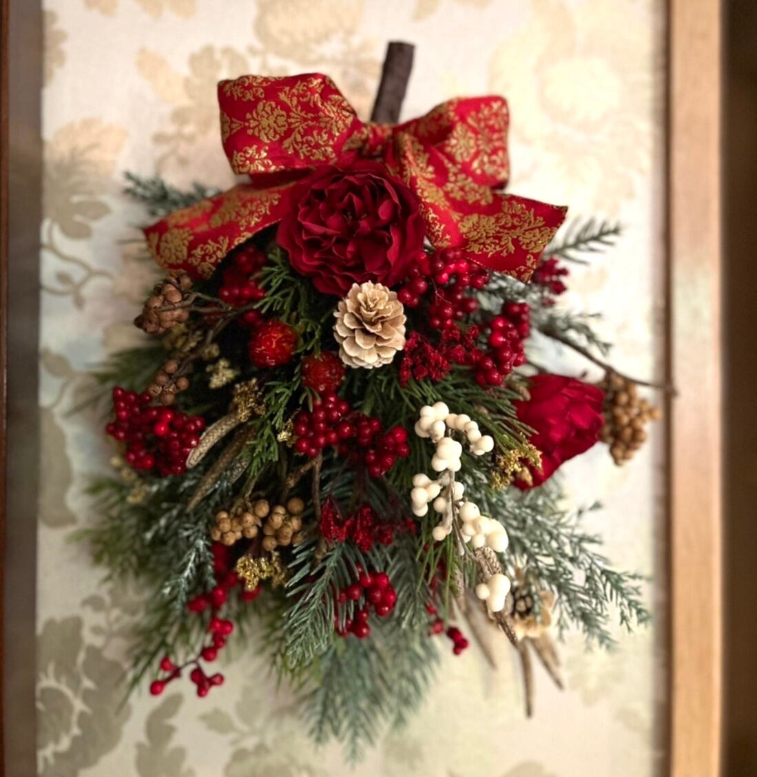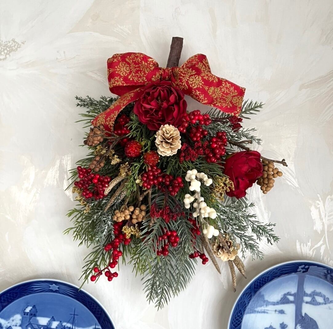 小さめで丸めの赤薔薇がポイントの可愛いスワッグです。
