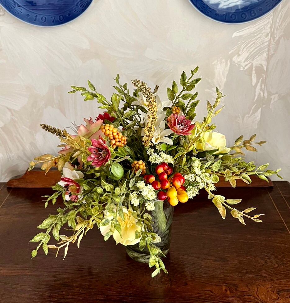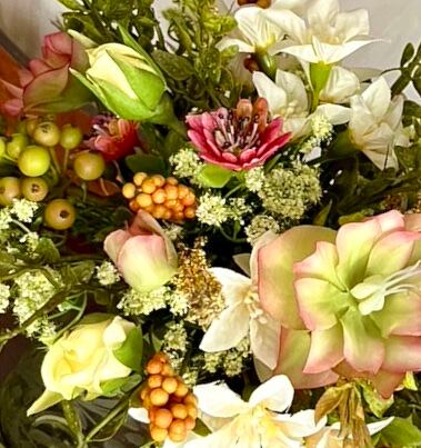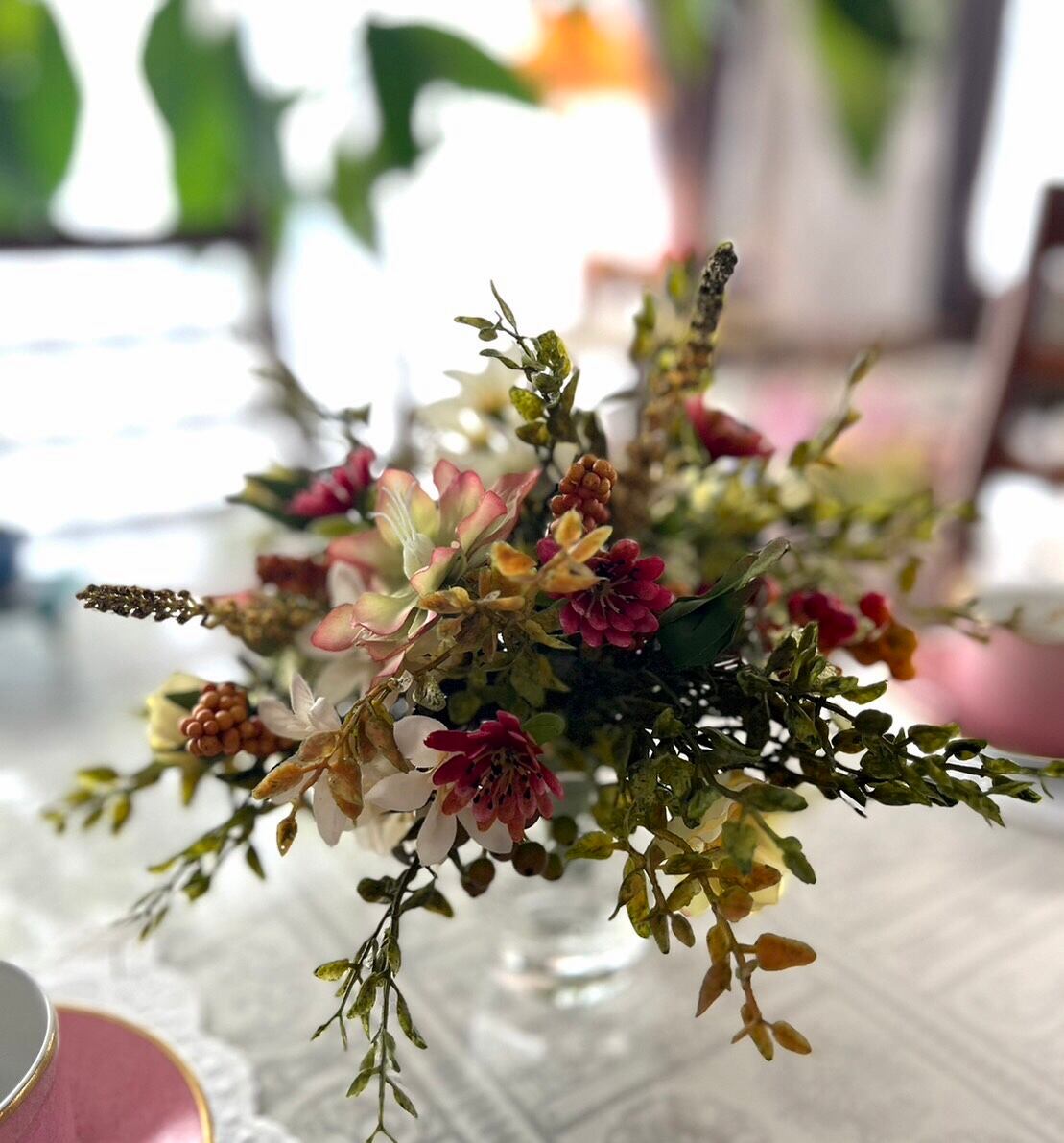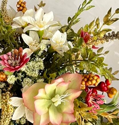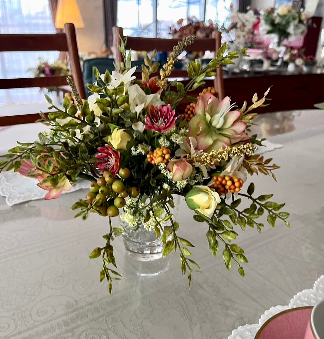 作品のこだわりは色。グリーンと実もの、薔薇に