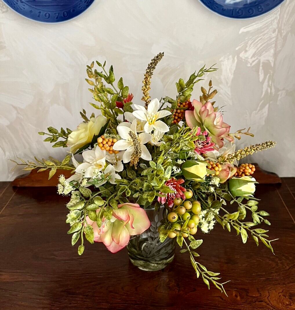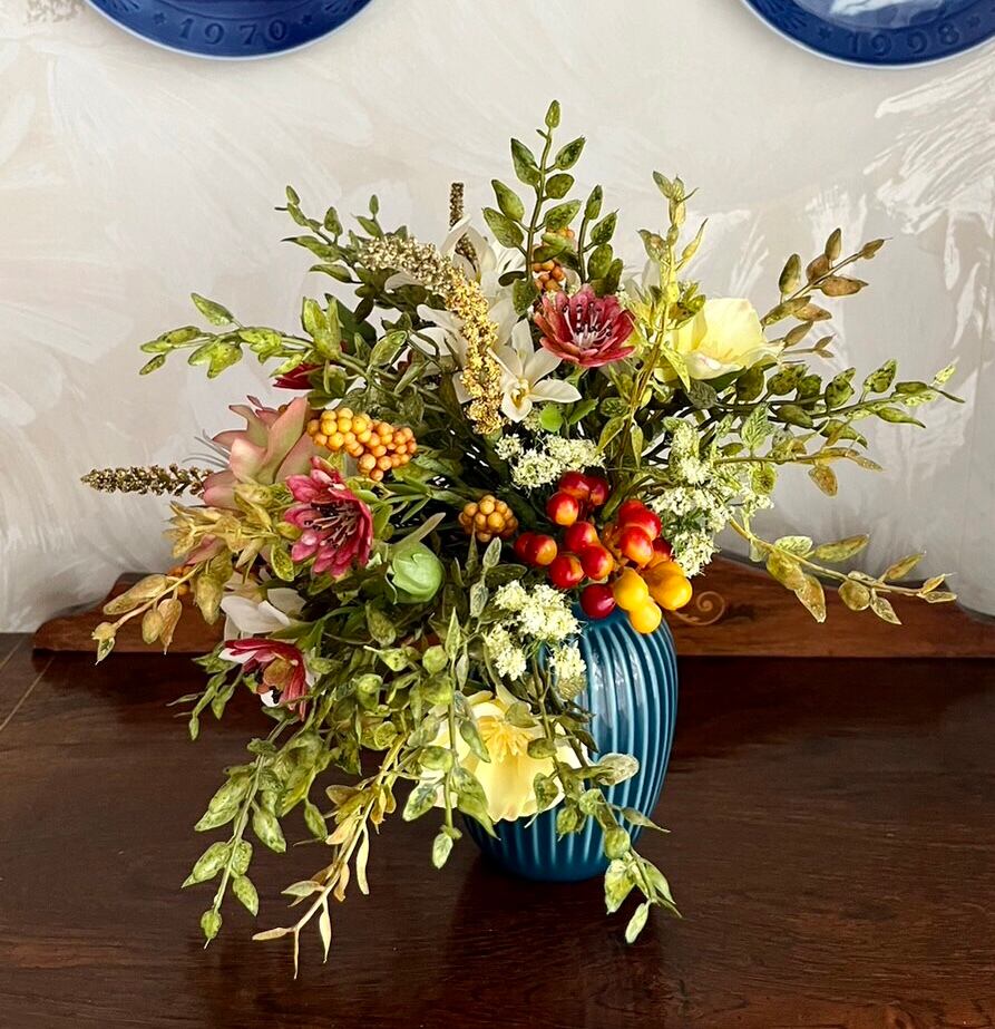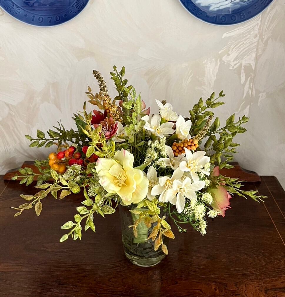 作品のこだわりは色。グリーンと実もの、薔薇に
