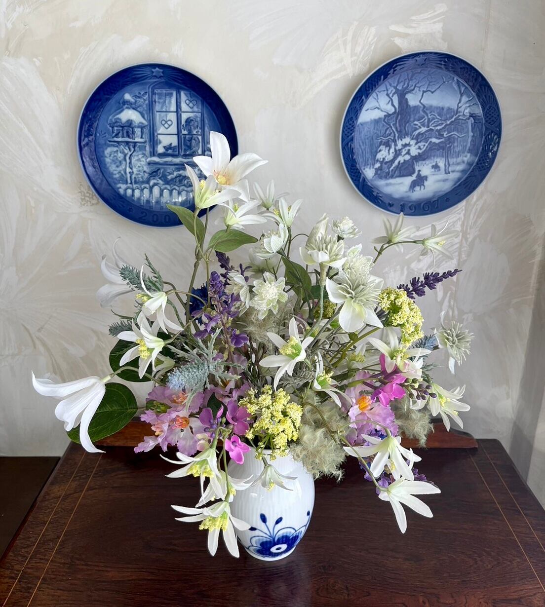 ラベンダー、矢車草、スモークツリー