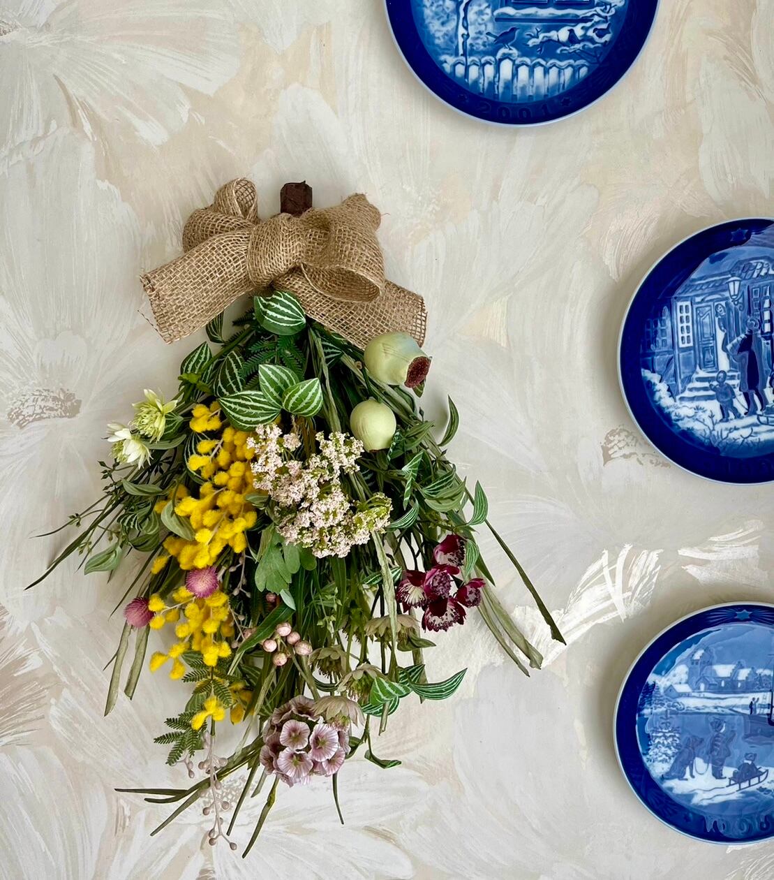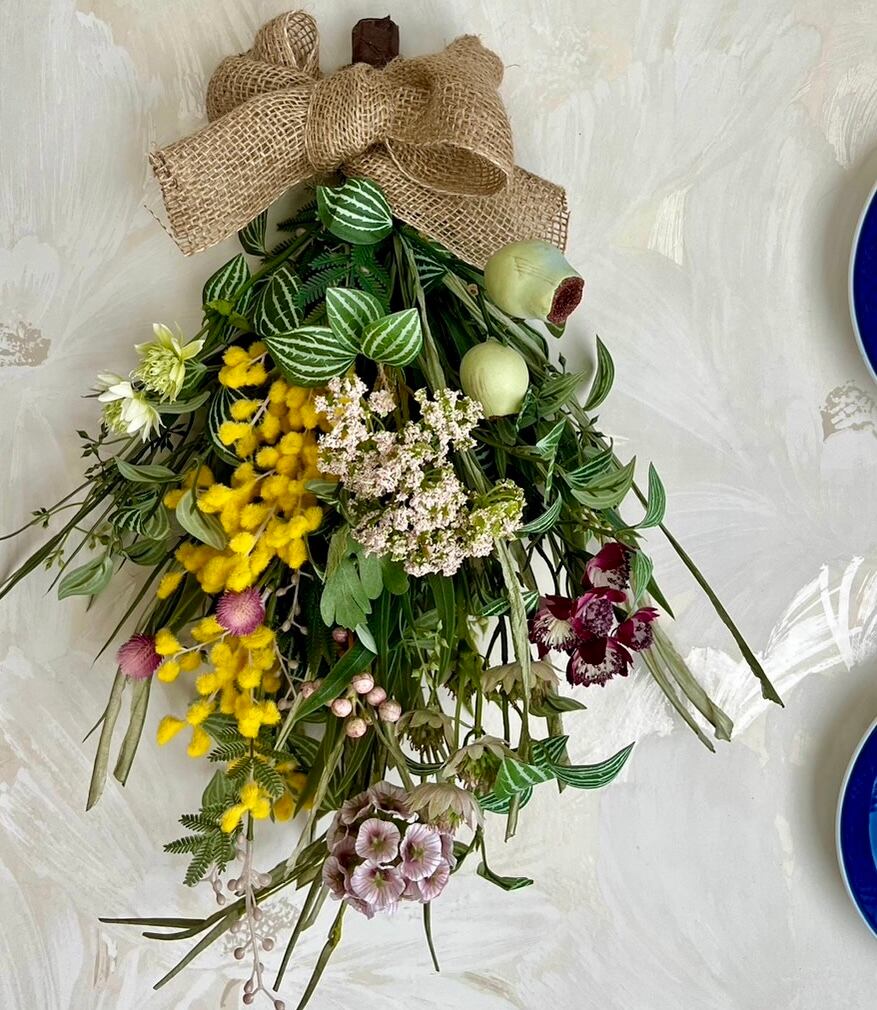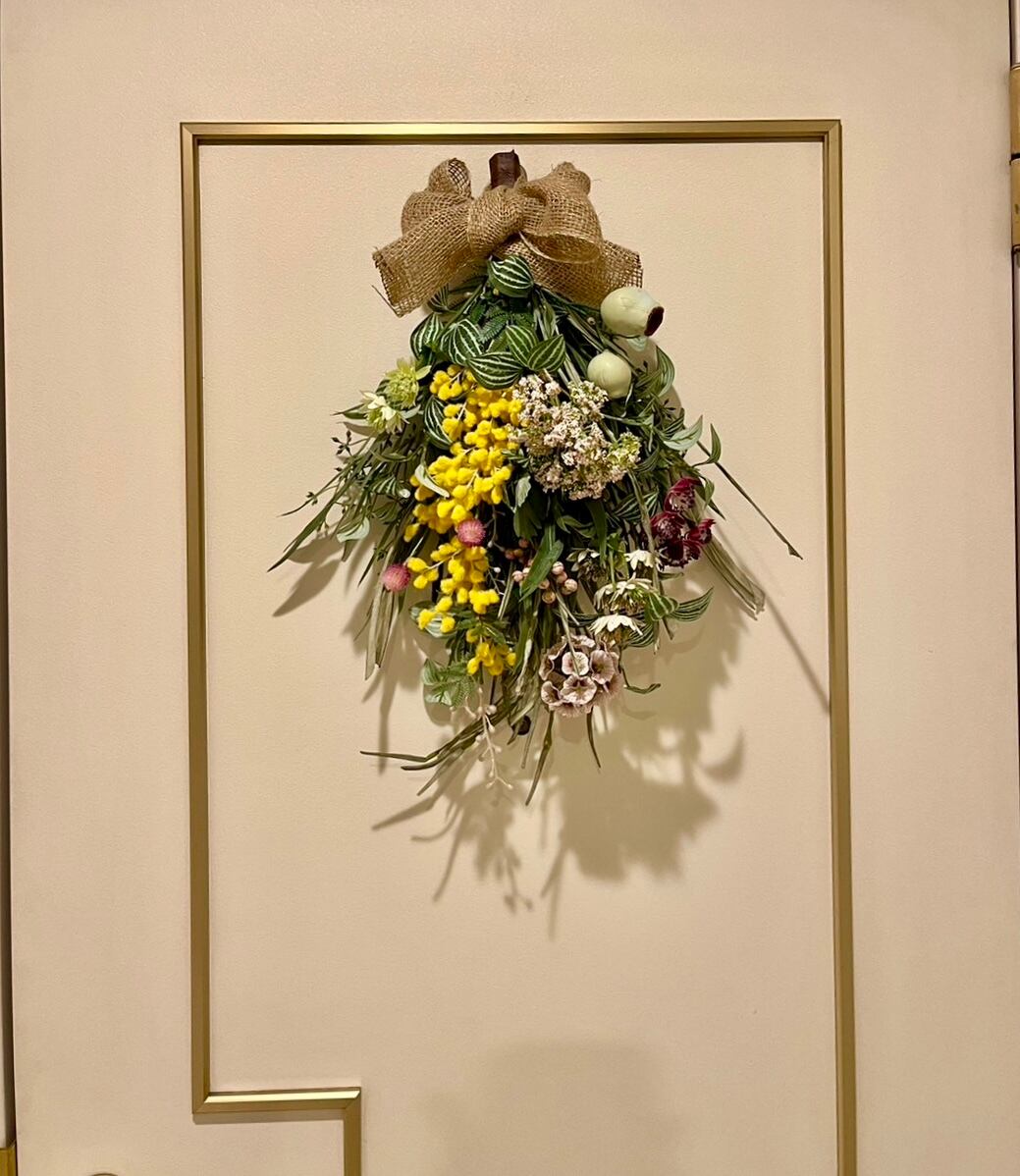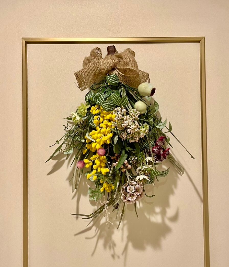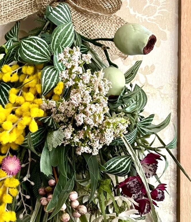 プリムミモザ、細葉ユーカリスプレー、パピエグラススプレー、ペパロミアスプレー、マレーナアストランティア、アンジェリカ、スカビオーサステラータ、千日紅、ユーカリトランペット、アローラベリースプレーなど