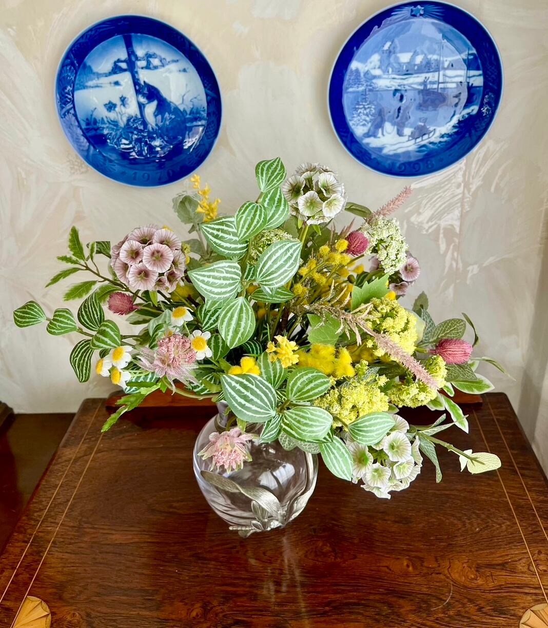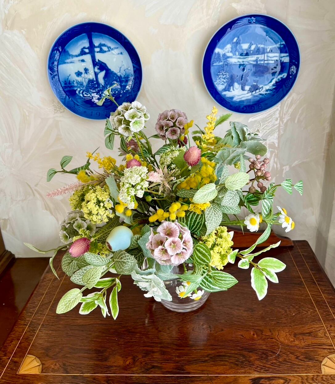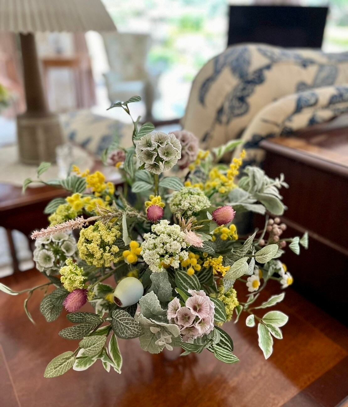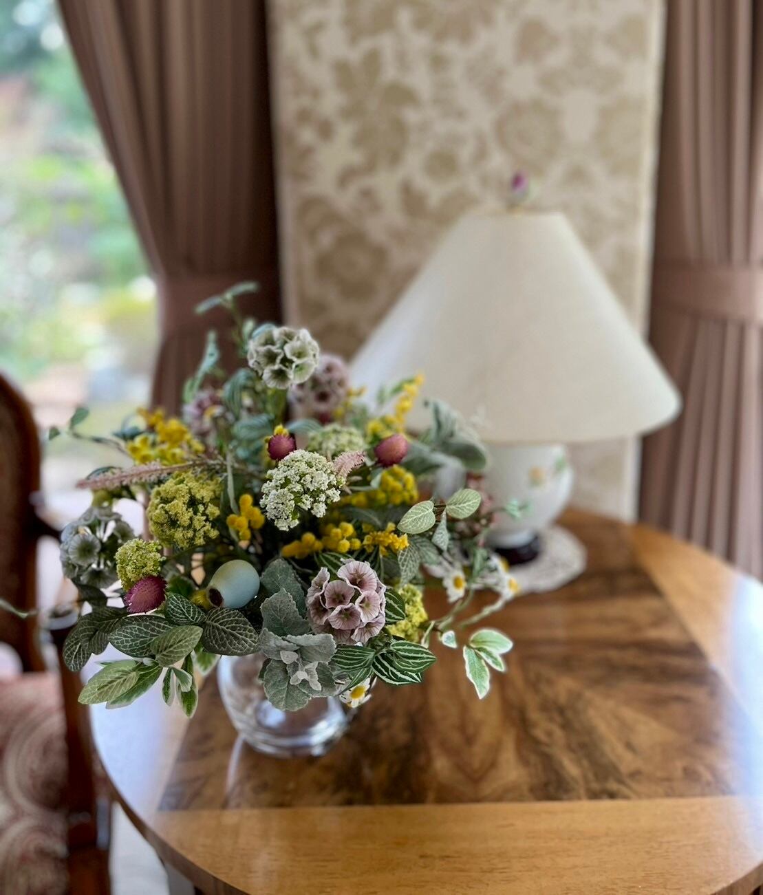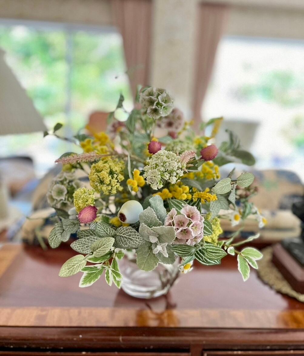 プリムミモザ、ペパロミアスプレー、フィットニアスプレー、アンジェリカスプレー、スカビオサステラータ、ボヌールカモミール、千日紅、ブライディミント、アローラベリースプレー、ユーカリトランペット、ステラベロニカ、ニュアンスフォックステーラー、ミニファイカスなど