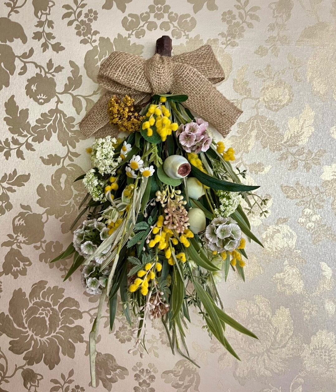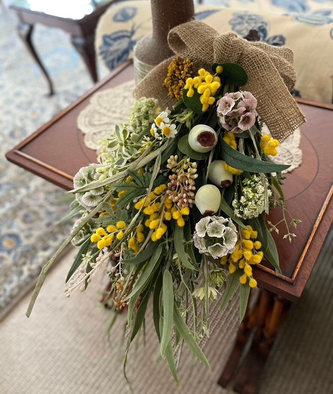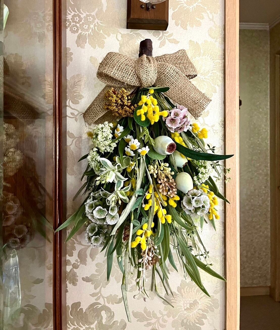 プリムミモザ、細葉ユーカリスプレー、パピエグラススプレー、スカビオーサステラータ、ボヌールカモミール、アンジェリカスプレー、マレーナアストランティア、ユーカリトランペットなど